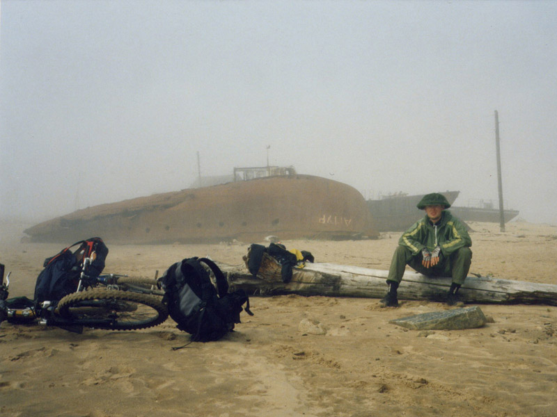 лодок и кораблей и заброшенные серые строения. Присаживаемся возле ржавого перевернутого