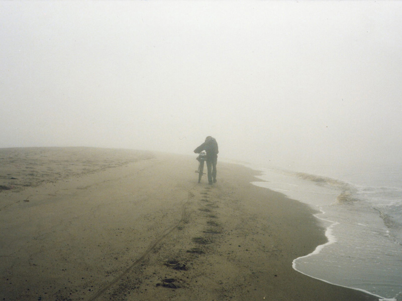Идем вдоль воды по мокрому песку в сторону реки. Слева возникает кладбище деревянных