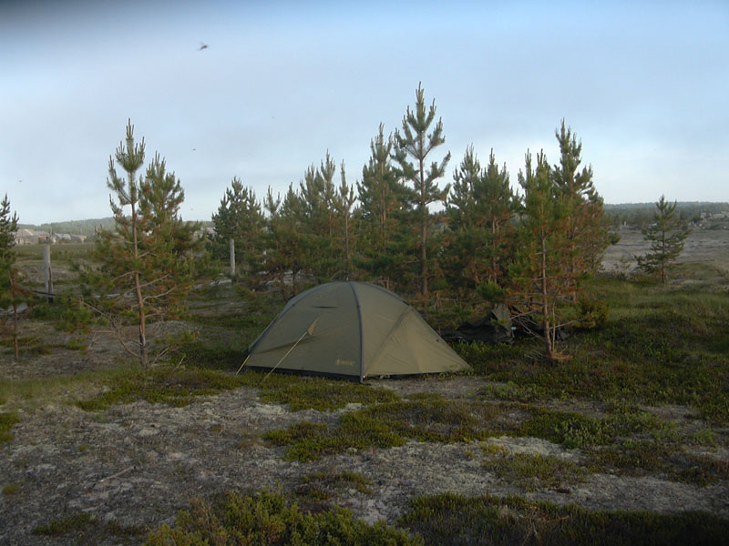 морю у аэродрома редкие заросли низкорослых сосенок. Тут и поставим палатку.